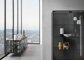 Fiam Design. Marcel Wanders Dimensions : l 101 x h 163 x p 41 cm Vitrine avec profils en aluminium vernis, disponibles dans les finitions métalliques champagne et gris volcan. Base en verre trempé extra light de 6 mm, verni dessous pour s’adapter aux profils ; structure et portes de la vitrine en verre trempé extra light, fumé ou bronzé de 6 mm ; étagères en verre trempé extra light de 8 mm. La vitrine est également disponible en verre plat (pas en fusion) et en verre semi-réfléchissant. Système d’éclairage LED intégré dans les montants avant de la structure (optionnel).