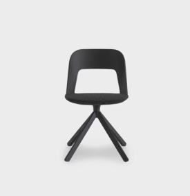 Chaise avec assise en mousse de polyuréthane ignifugé et revêtu en tissu, dossier en multiplis de bois plié. Base pivotante en bois massif. Patins en nylon avec feutre.