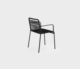 Chaise avec accoudoirs empilable en acier inox 304 laqué polyester blanc, noir ou microbillé. Assise et dossier faites à la main en double fil retordu en polyester avec main cotonnière. Patins en polyéthylène.