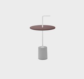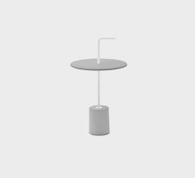 Petite table d’appoint avec base en marbre Carrara blanc, ou Marquinia noir ou en beton. Tige et poignée en acier inox 304 laqué polyester. Patins en caoutchou sous la base. Plateaux en plusieurs formes en HPL Fenix® 10 mm avec percement pour la poignée.
