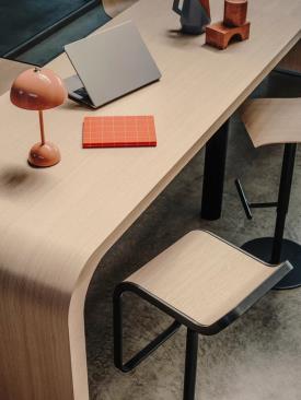 Deux mondes, deux "temps" se rencontrent comme le veut la tradition du brunch. D'un côté le plateau en bois qui se courbe jusqu'au sol et change doucement d'épaisseur, de l'autre la rigueur du support en métal, lui aussi verni en noir et blanc. D'une grande originalité dans le jeu des asymétries, cette table modulable se compose librement, croise les hauteurs et s'ouvre dans le sens d'une étoile et d'une vague. BRUNCH, versatile et disponible en version électrifiée, est idéale comme comptoir de cafétéria, table haute comme poste de travail dans les espaces publics.
