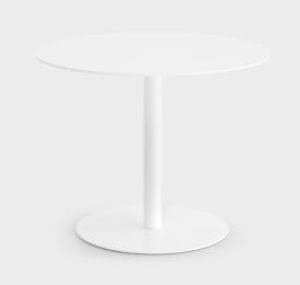Table avec base en acier zingué revêtu en acier inox Aisi304 finitions ”toile de lin” ou laqué époxy. Colonne chromée mat ou laquée époxy. Plateaux en multiplis de bouleau revêtu en bois ou lamifi é avec bord visible, HPL 10 mm ou en MDF laqué. Patins en feutre sous la base.