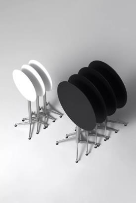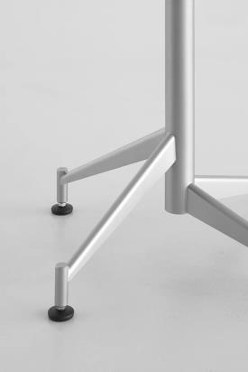 Table avec plateau rabattable en multiplis de bouleau revêtu en bois ou lamifié avec chant visible ou en HPL 10 mm. en plusieurs finitions ou en MDF laqué. Base en acier inox Aisi 304 microbillé avec patins réglables en polyéthylène.