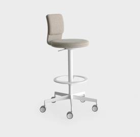 tabouret pivotant réglable en hauteur, base et repose-pieds en aluminium microbillé ou laqué époxy avec roulettes auto-bloquants. Assise et dossier en MDF et mousse de polyuréthane ignifugée revêtue de tissu, peau ou ecopeau. Le dossier est réglable en hauteur.
