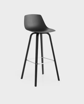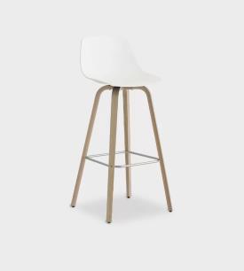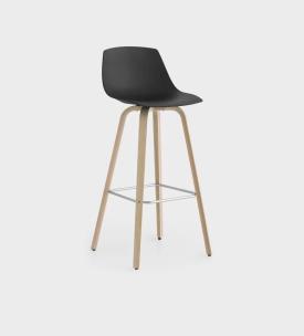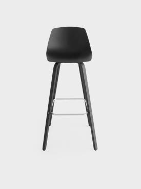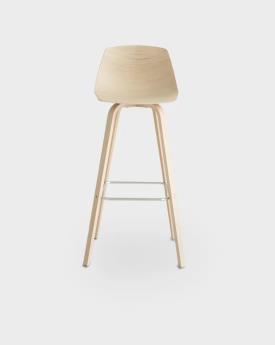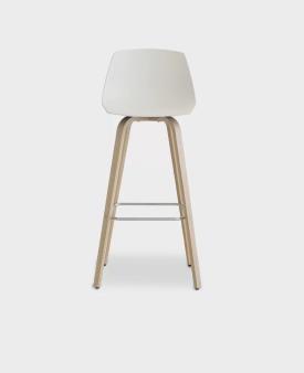 tabouret fixe h. 75 cm. avec piétement en multiplies courbé en chêne blanchi ou noir pore ouvert et repose-pieds en fil d’acier chromé mat. Assise en multiplies courbé avec technologie 3D en plusieurs finitions, en Baydur laqué blanc ou noir ou complètement revêtu en cuir ou tissu. Patins en nylon avec feutre.