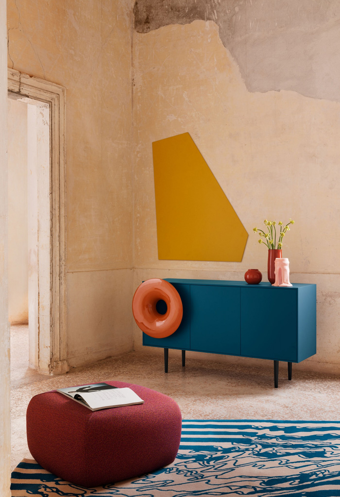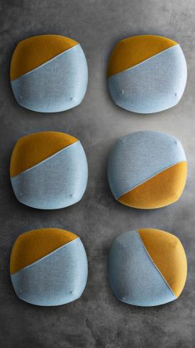 Furoshiki est un jeu de motifs et de couleurs. Une enveloppe en tissu constitue le rembourrage avec une géométrie rigoureuse et une délicatesse toute orientale. Les coutures deviennent des détails de style, en divisant l’objet en portions précises. Ainsi, les trames et les couleurs des tissus se croisent et se répondent, puis continuent dans des directions opposées.