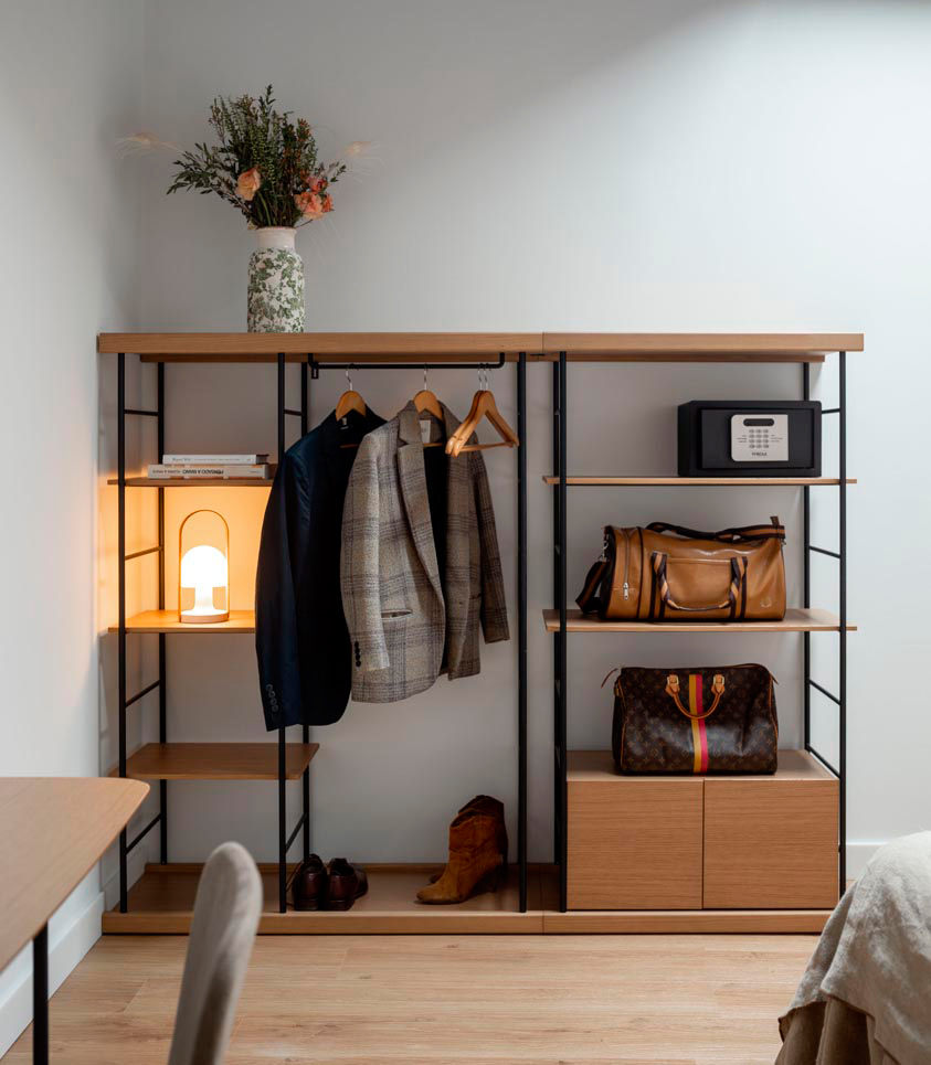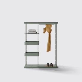 Design. Yonoh Creative Studio Dimensions : l 110 x h 150 x p 43 cm petite penderie ouverte Bost laquée en Moss.